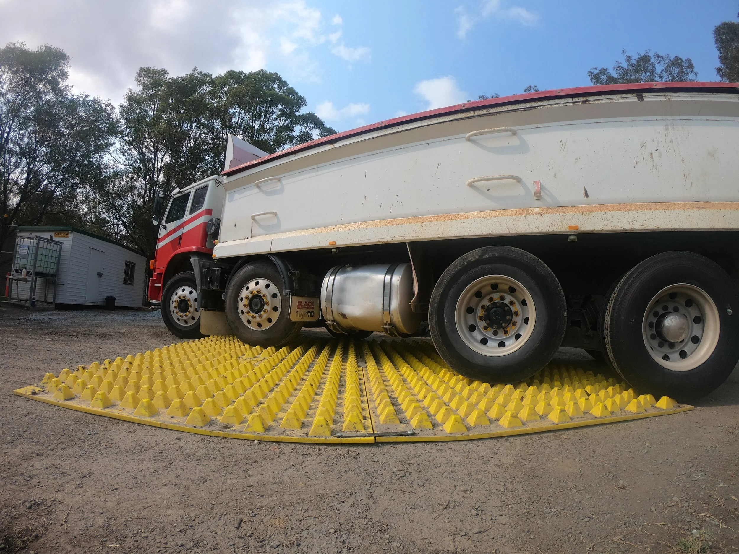FODS stands for Foreign Object Design System, developed to replace steel rumble strips, steel plates, and rock construction exits. Where FODS differs is its unique layout of alternating pyramids, each about seven centimetres high. These pyramids are designed to open tyre lugs to loosen and remove sediment from the passing vehicle without causing any damage.